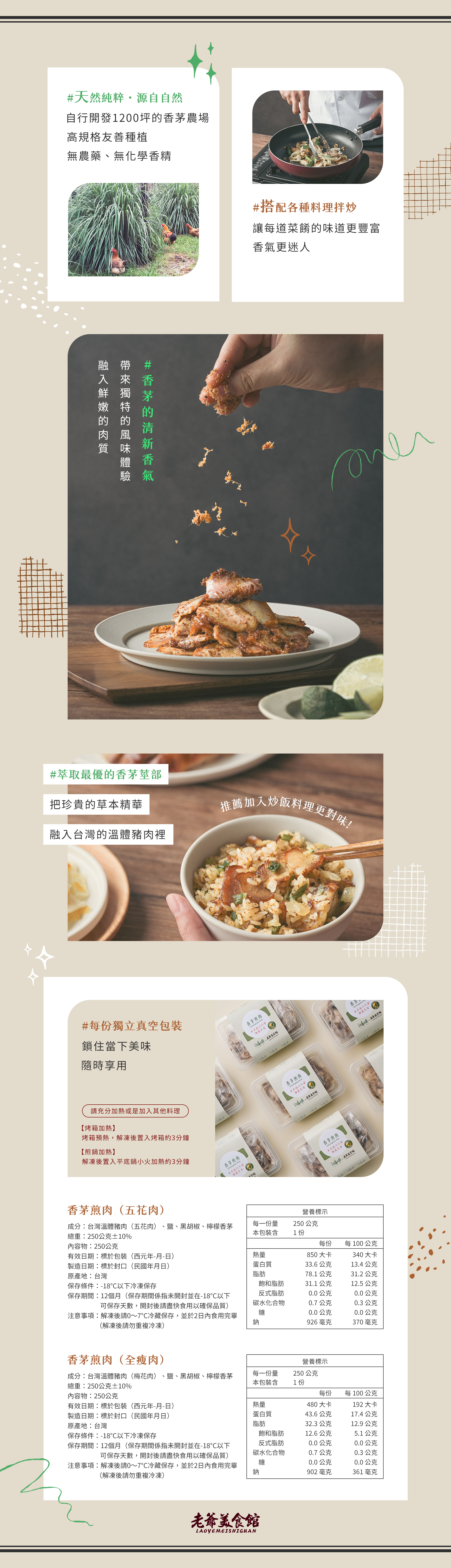 淡淡香茅天然口味,搭配各種料理拌炒,讓每道菜餚的味道更豐富,香氣更迷人,萃取最優的香茅莖部,把珍貴的草本精華,融入台灣的溫體豬肉裡,推薦加入炒飯料理更對味。